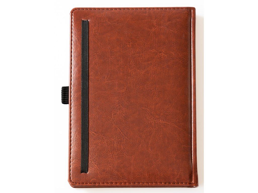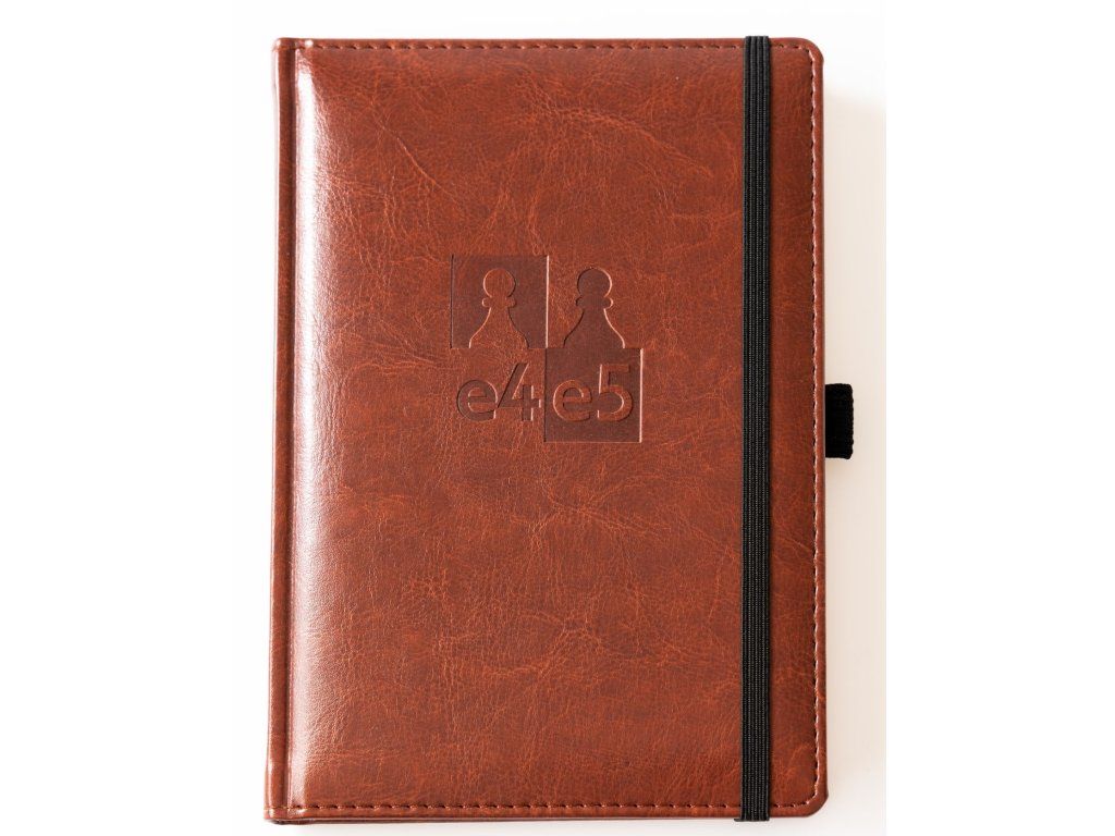 Качествен бележник с изкуствена кожа и щамповано лого e4e5. Бележникът се затваря с просто прехвърляне на ластик и съдържа държач за химикал, благодарение на който ще имате химикал винаги до бележника.
