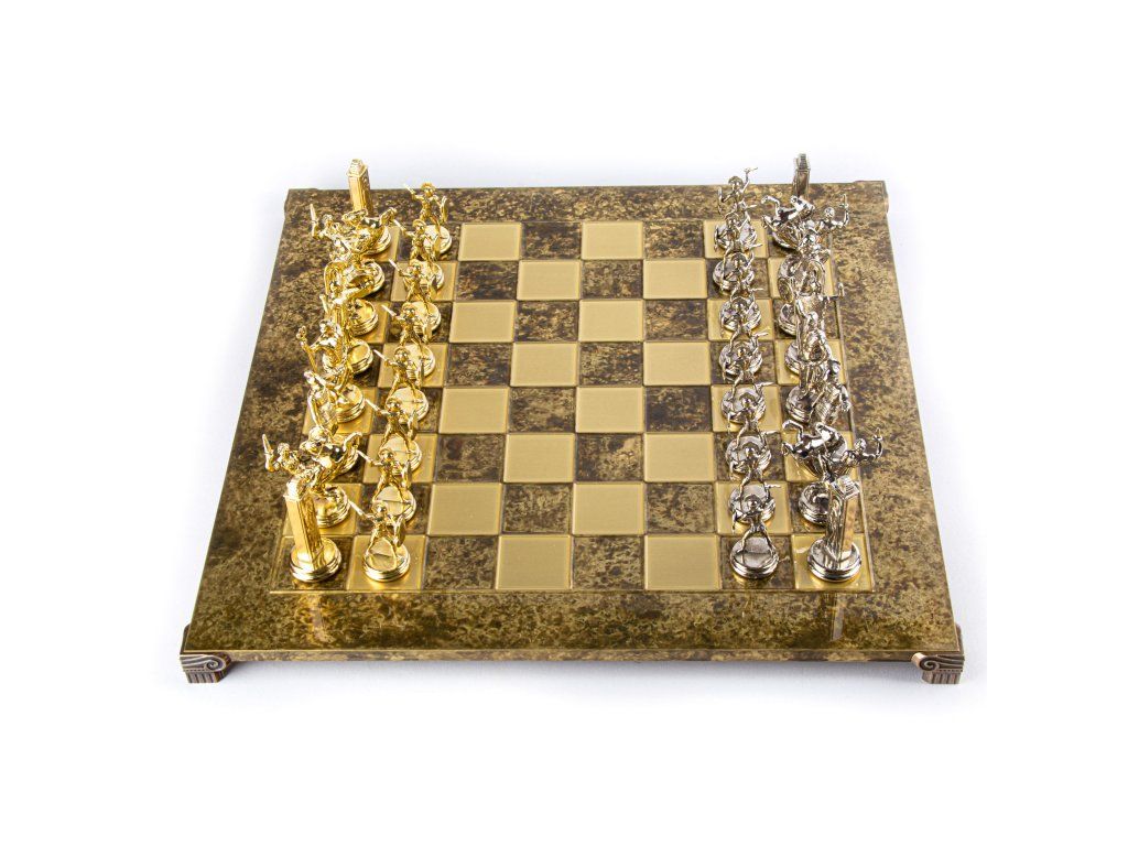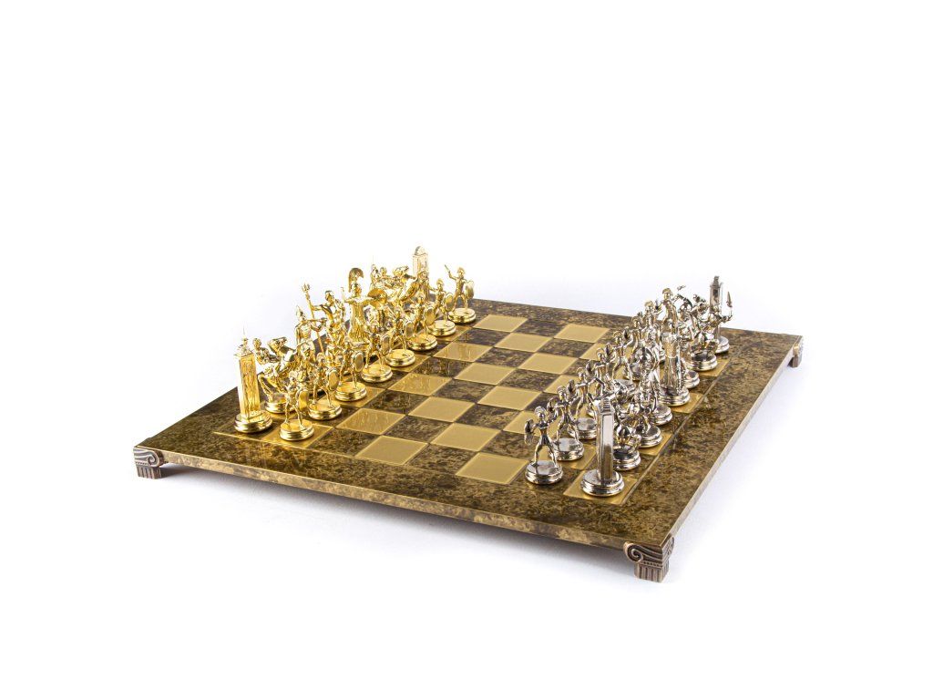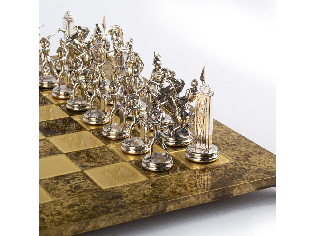 Потопете се в легендарния свят на древна Гърция с ръчно изработения шахматен комплект „Гръцка митология“. Този изящен комплект, включващ златни и сребърни шахматни фигури и бронзова шахматна дъска с размери 54 x 54 cm, съчетава изкуство и история в луксозен комплект, идеален за всяка игрална зала.